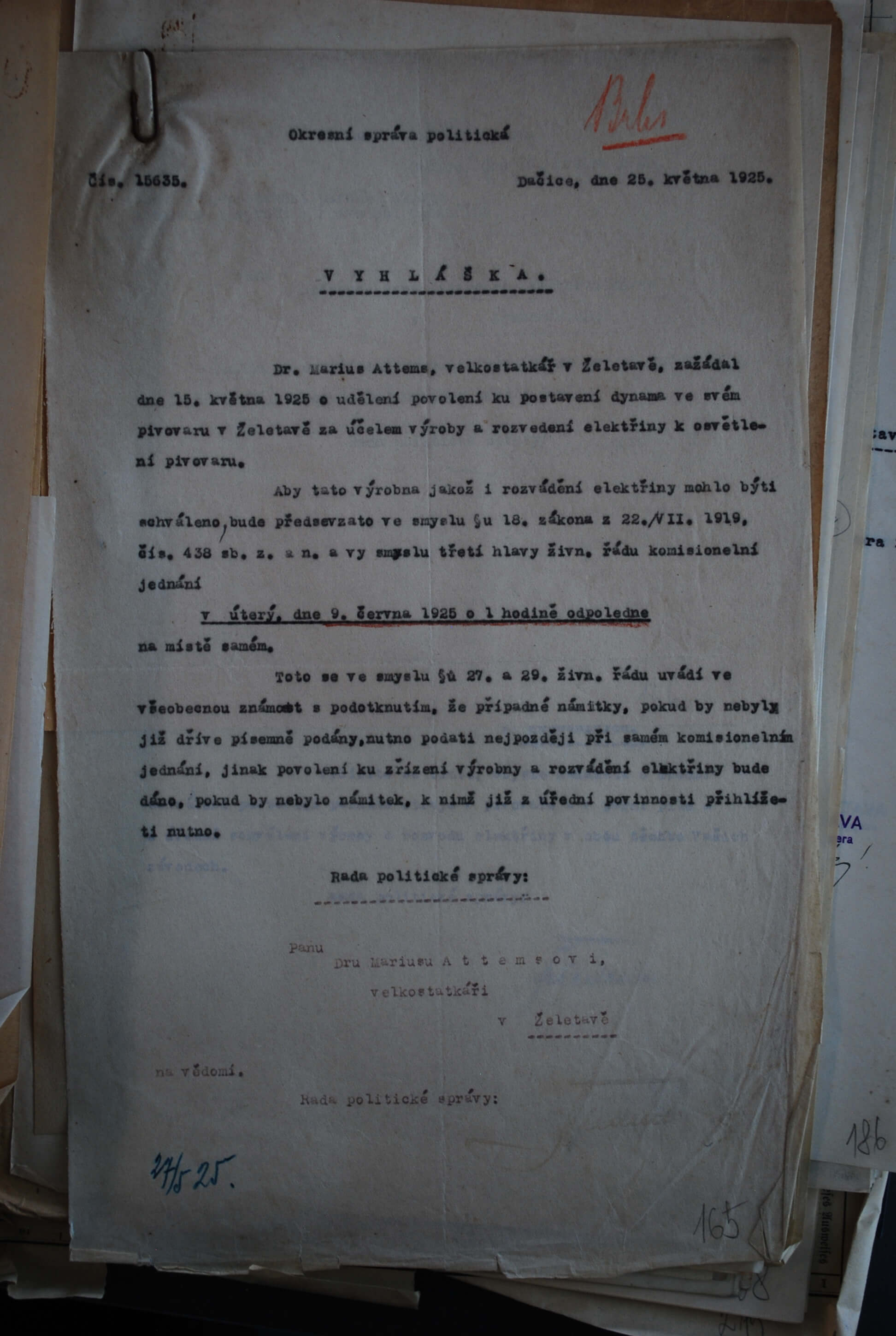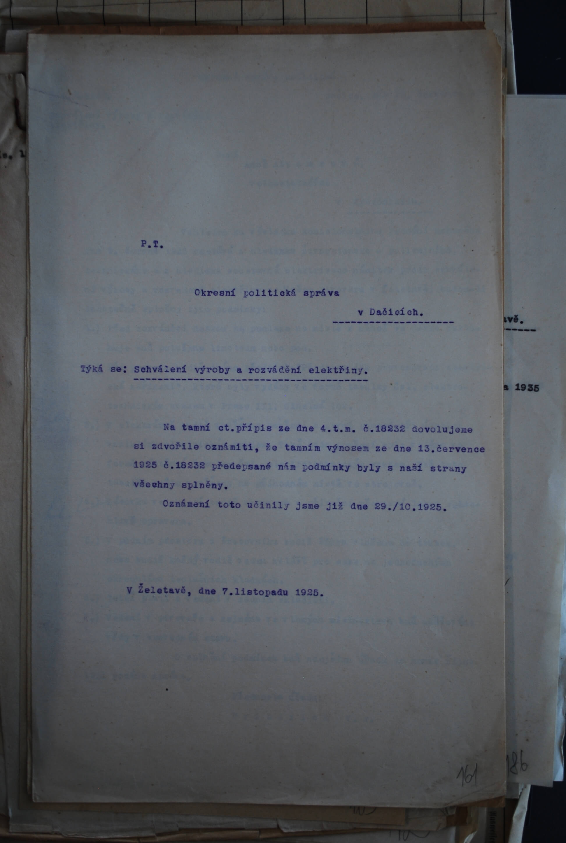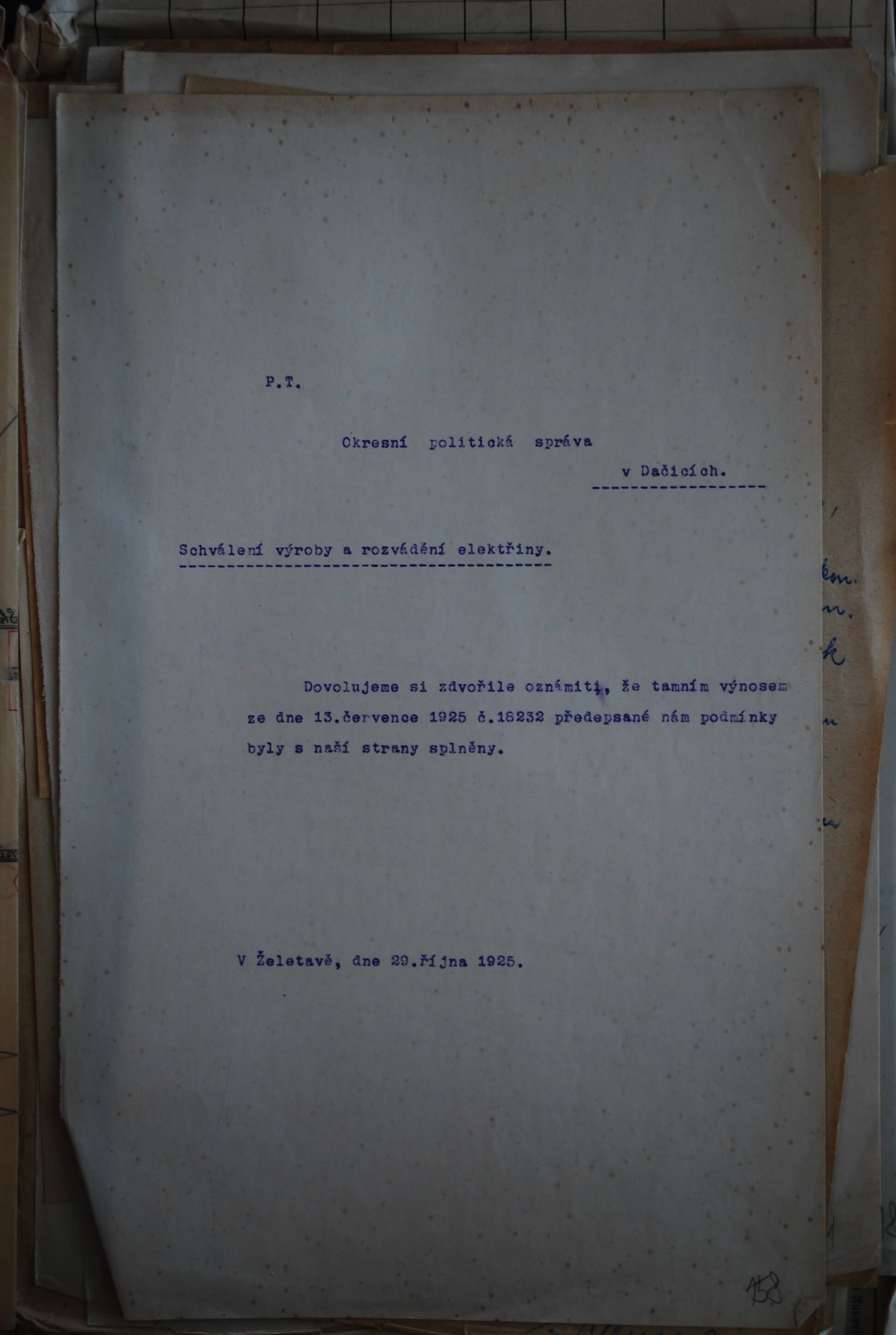 Při instalaci byla velká pozornost věnována umístění ochranných tabulek, přičemž byl kladen důraz na jejich umístění a zhotovení dle norem vydaných Československým elektrickým svazem v Praze. Obdobně byla pozornost věnována správnému vedení vodičů ve vlhkých prostorách a vůbec udržování elektrického zařízení v bezpečném a řádném stavu. Zajímavé je nařízení, že pod rozváděčem musí být umístěno linoleum. Jednalo se o ochranný prvek izolující spojení vůči zemi. A tedy chránící obsluhující osobu před úrazem elektrickým proudem. Nad povolením a dodržováním předpisů bděla Okresní správa politická. Konkrétně úředníci okresu Dačice, kam Želetava tehdy spadala.